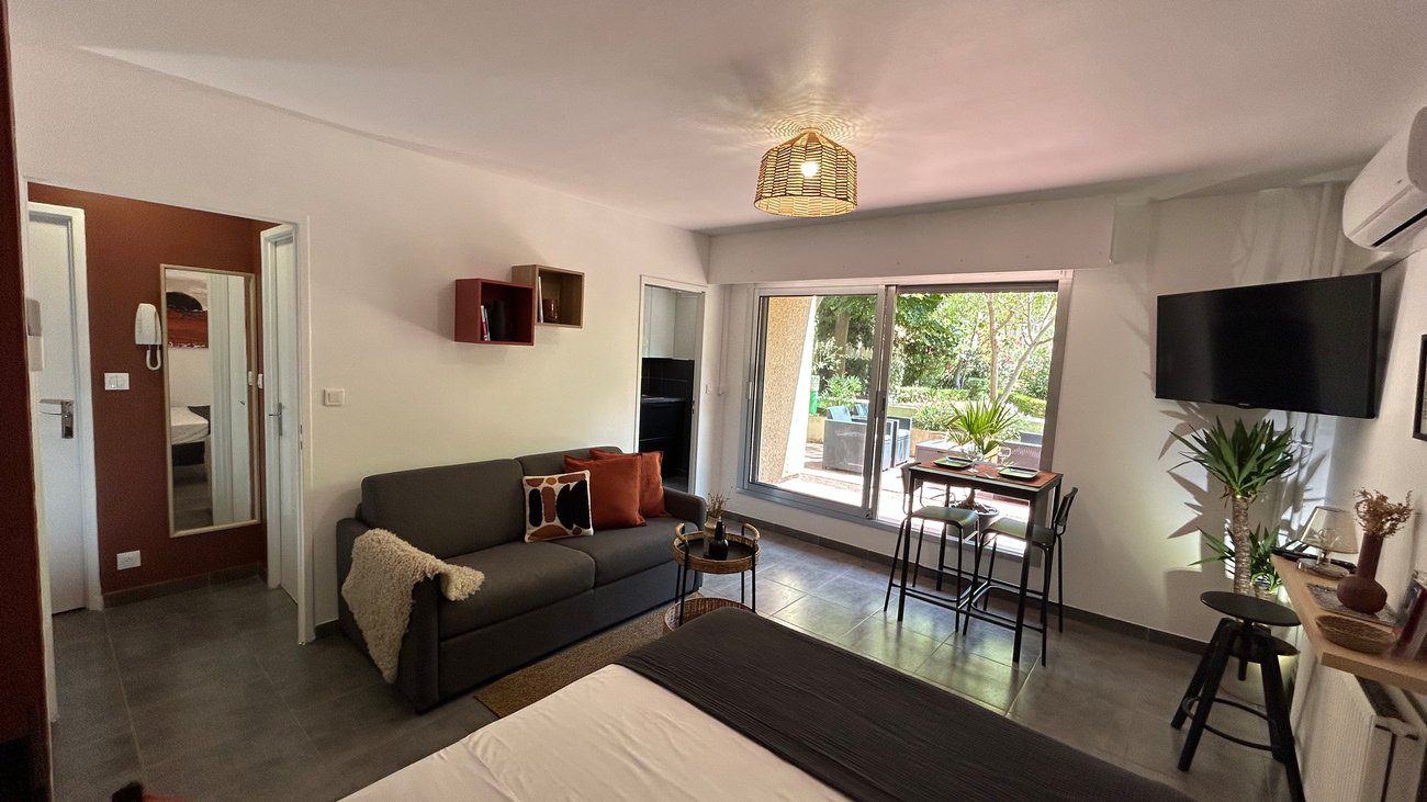 It is located at 2 Bis Rue Maurice Favier, 13006 Marseille, just off the Rue Edmond Rostand and the Rue Paradis. On the ground floor of a recent residence, facing the garden, this studio apartment will surprise you with its atmosphere and Scandinavian vintage mix. It comprises a living room with a double bed, a dining area, a sofa bed and a separate kitchen.